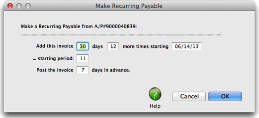 2 Click the Make Recurring Payable button (or choose Edit > A/P