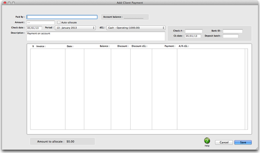 Posting a client payment updates the client account balance, unpaid invoices in Accounts Receivable and the General Ledger. When client payments are first added they are unposted. Unposted invoices can be easily changed, letting you edit payment amounts before the client balances are updated.