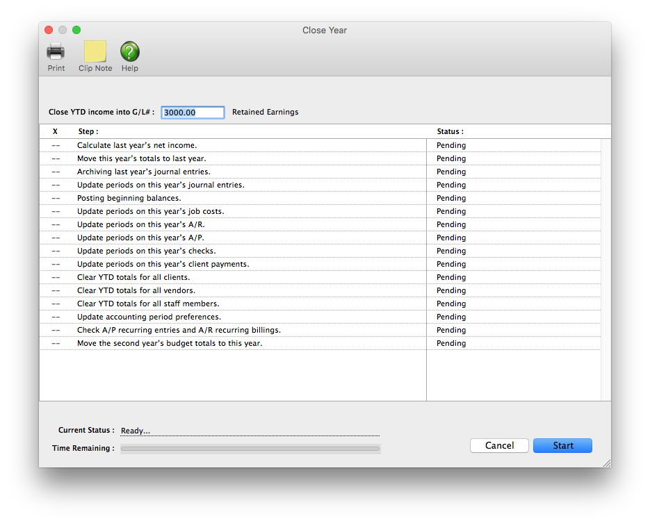 Clients & Profits supports two simultaneous fiscal years, so there’s no real sense of urgency about year-end closing. The year can be closed well into the next fiscal year. Throughout that time you can enter data into both the current year and last year, then print financial statements for any accounting period.