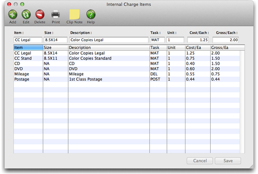 Internal charges can be billed at net or gross. Although each internal charge item has a standard (or “retail”) price, this amount can be changed when the internal charge items are entered. This makes it easy to charge different clients different prices for internal charges.