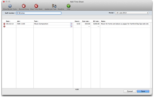 Job and Task Every time entry needs a job number and a job task. This information is critical for accurate job costing. Even unbillable time must be given a job number (such as a client’s unbillable job, or the agency’s account service job number). The task should reflect what was performed for the time entry (i.e., artwork, design, etc.). Your standard task will be copied from your Staff record onto the time sheet automatically, but it can be changed. If you don’t have a standard task, the time sheet’s task will be blank. Giving yourself a standard task, however, saves a step -- it’s one less detail to enter onto the time sheet.