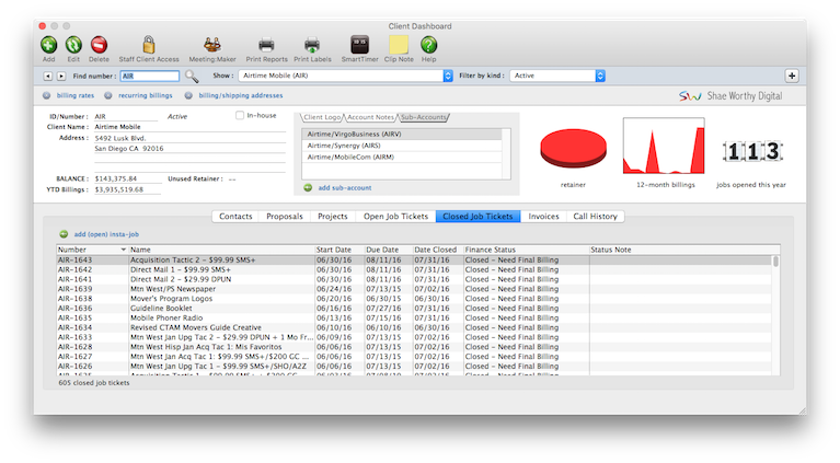 For better job tracking, you can have many clients from the same organization. A large corporate client, for example, might have 100 different departments or contacts who initiate jobs. Anyone who authorizes work can be added as a separate client account. When jobs are billed, the work from several different clients can be combined on one invoice -- and even billed to an entirely different client account.
