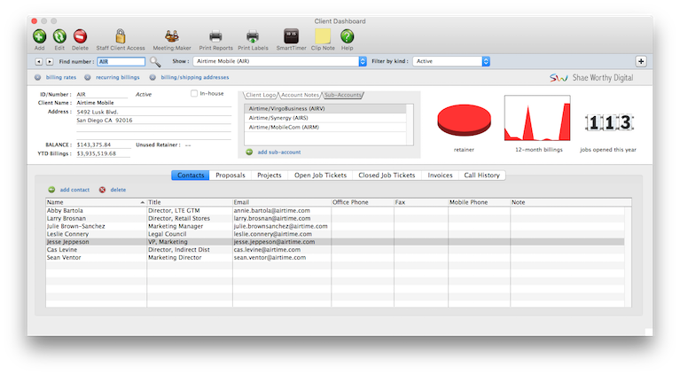 • Each client account has a contact list of people there you work with, everyone from an admin assistant to the CEO.