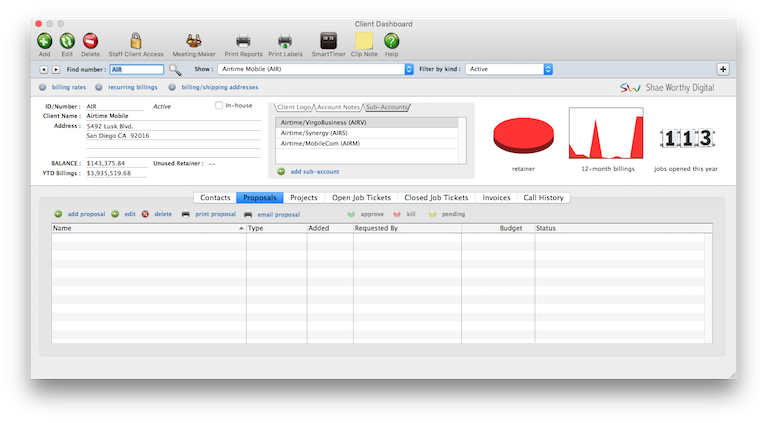• Client accounts can be tagged as inactive if they haven’t done work for a while, but are still potential business.