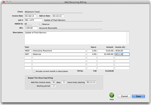 • If you bill retainers, you can schedule a year’s worth of retainer billings for each client.