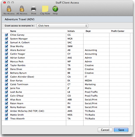 Customizable client/staff access privileges control who can see a client's jobs. They let certain users see a client's job tasks, while keeping out other users. If a user is given "no access" to a client, he or she can't see the job's tasks, estimates, costs, or billings. This option lets you define on a client-by-client basis just who can work with certain clients.