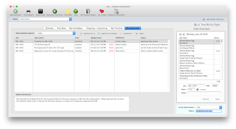 The creative dashboard single source of truth: your deadlines, your discussions, your timeline, your approvals, your time card