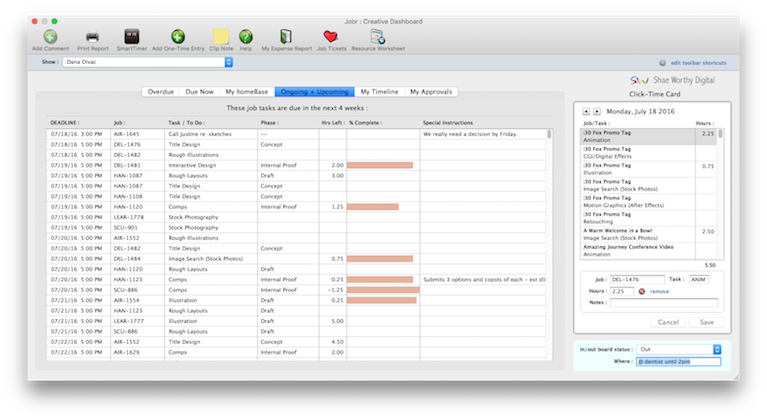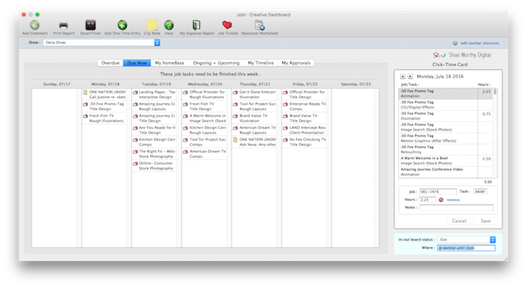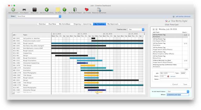 The Creative Dashboard combines a staff member's daily time card, job hot sheet, and Work To Do into a single window. The Creative Dashboard lets creatives, production staff, and free-lancers see all of their important day-to-day information at one time.