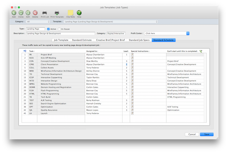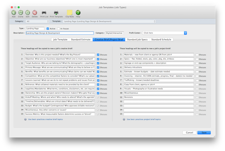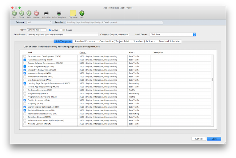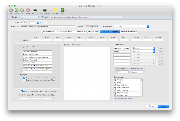 When a job template is created, you’ll give it a name. The name is the job type, such as Print Production, Annual Report, Brochure, TV spot, or whatever you need. What you call your job types isn’t important, since it’s used inside the shop only. Clients usually don’t see your job types. So consider how you name the templates: The names you use are important for job tracking, however. Job lists show jobs by job type, conveniently summarizing similar jobs together. Traffic reports show jobs and their milestones (the key events and approvals for each job) by job type, for easier job tracking. And profitability reports compare estimates, costs, billings, and profits by job type.