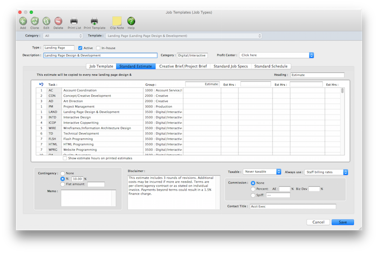 • Each template can have a standard estimate, which is copied to every new job. This can make the template list something like a price list for standardized, routine jobs (e.g., homepage redesign, email blast, etc.)