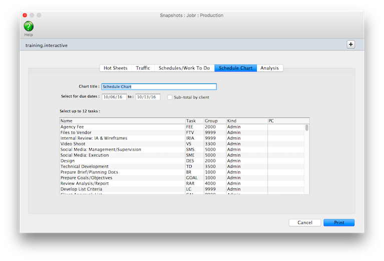 Schedule Chart The Schedule Chart lets you choose the unfinished tasks you want to see and sorts them by job number or client. So instead of seeing every unfinished task for the week you can print just a select few (e.g., artwork, copywriting, and design).