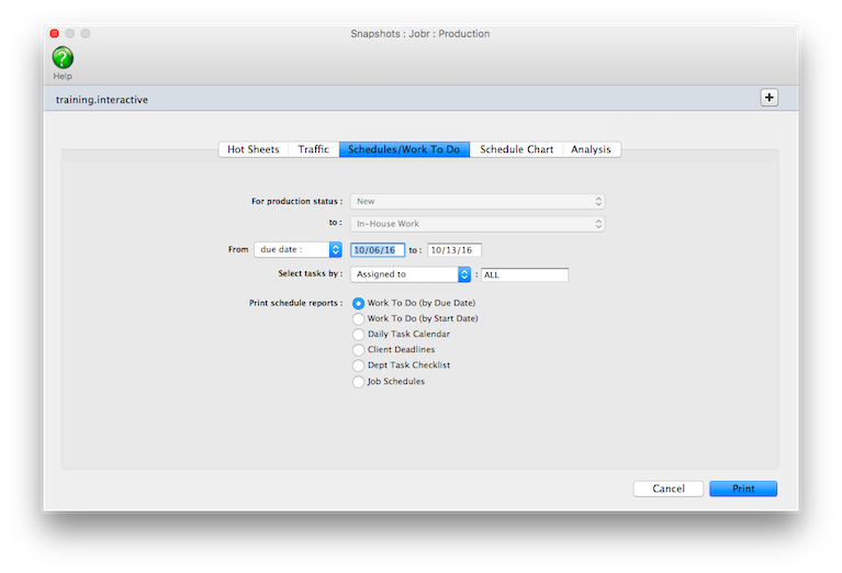 Schedules/work to do reports show unfinished job tasks by resource, client, AE, department, or task. These work-to-do reports can be printed daily to show everyone what they’re to do each day. Or, weekly schedules can be printed in advance for production meetings to help manage the week’s work load.